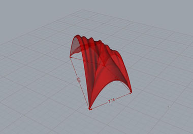 Modelagem no Rhinoceros através do Grasshopper: Em seguida, para uma melhor visualização da ''casca'', algumas curvas foram criadas, a partir do proposto pelos croquis e delimitações propostas depois, como a proporcionalidade das alturas das aberturas para os fluxos, como objetivo de em seguida formarem uma superfície que impedisse a insolação da área estudada. Como imaginado, foi-se necessário o aperfeiçoamento e complexação do algorítimo até que ele alcançasse a forma final.
